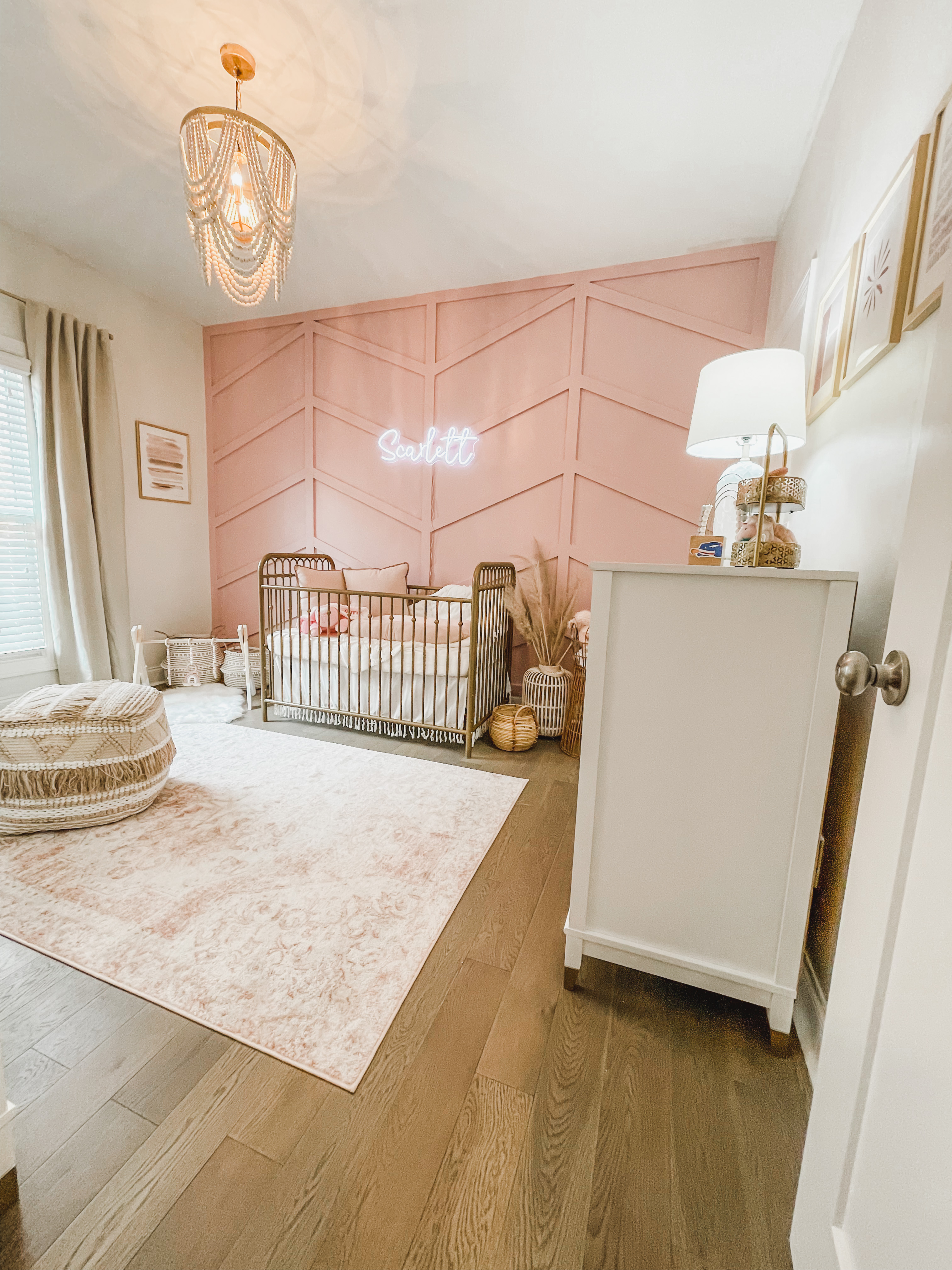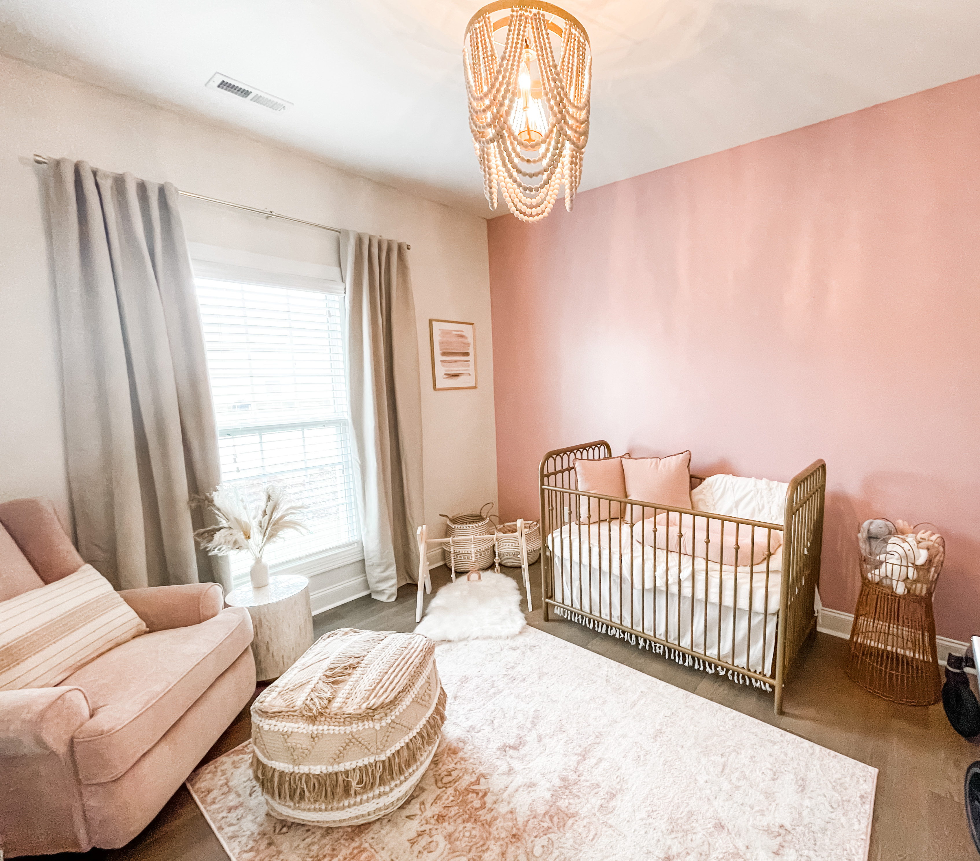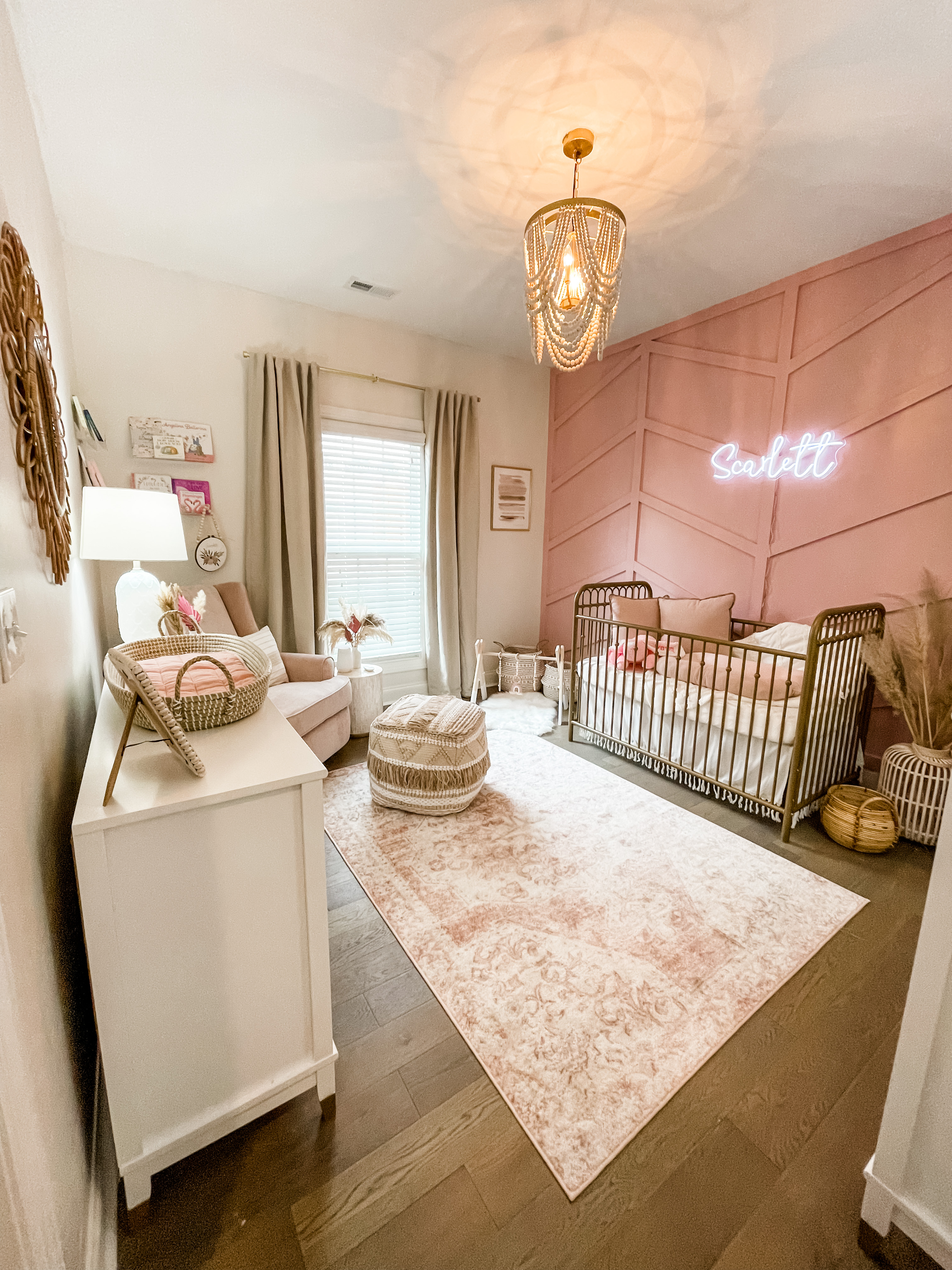 I knew from the beginning that I didn’t want a traditional baby girl nursery. Instead, I wanted something moody with a boho vibe, while still incorporating touches of pink. My goal was to create a room that could transition as she grew, with furniture that was both beautiful and practical.